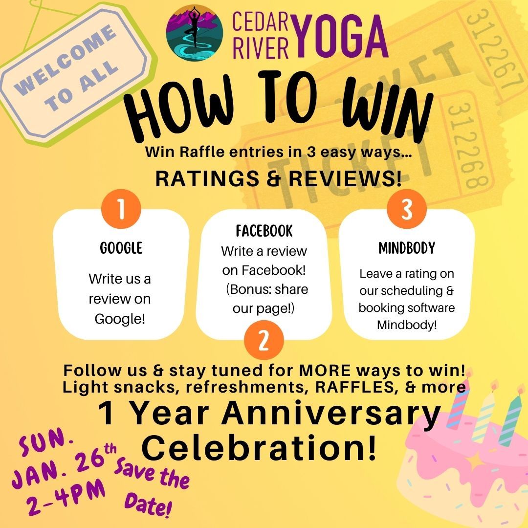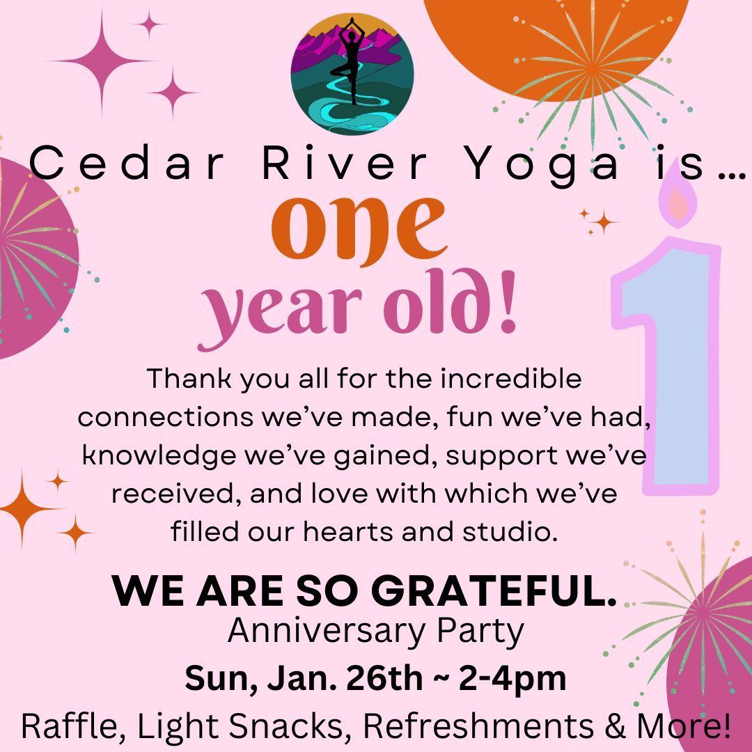 SAVE THE DATE FOR OUR ONE YEAR ANNIVERSARY PARTY! What a remarkable year it’s been at Cedar River Yoga! Thank you all so much for sharing your time & special selves with us; always bringing kindness & extraordinary energy to our space. We are SO grateful! Join us for raffles, light bites, refreshments, and so much more!